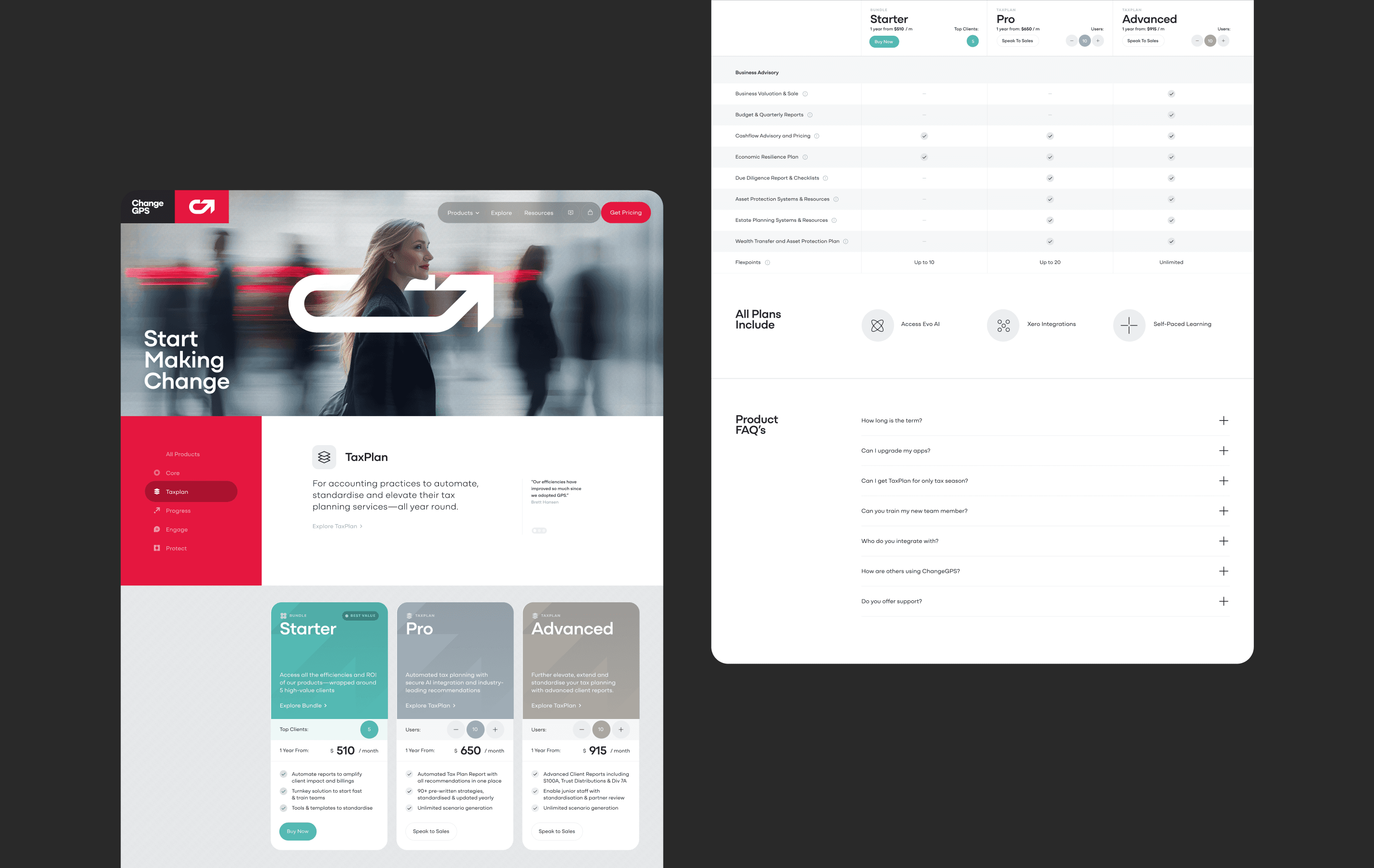The brand needed to feel contemporary, confident and technically forward, reflecting a platform now powered by AI and built to accelerate growth for accountants. A bold new identity centred on upward momentum was created, expressed through a geometric mark that combines a “C” with a rising 45° arrow. Red became a strategic differentiator in a sea of green competitors, while AI-generated imagery replaced traditional photography to create a cohesive visual world. The digital experience simplified a complex offering into a cleaner, more intuitive product journey.